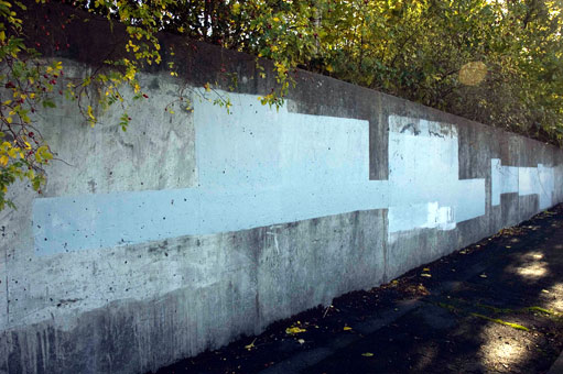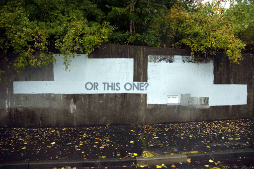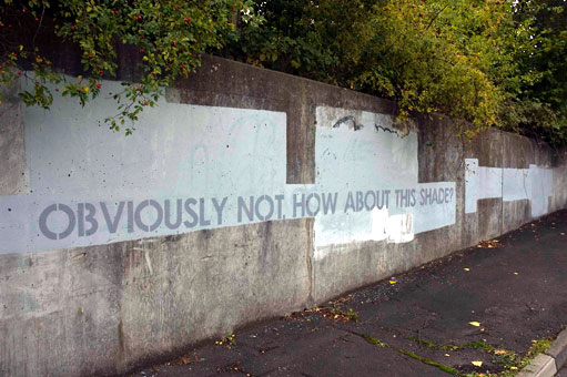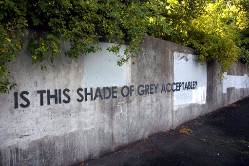 1ère question : trouver un mur et y inscrire en gris foncé au pochoir « Is this shade of grey acceptable? » (Cette nuance de gris est-elle acceptable ?)