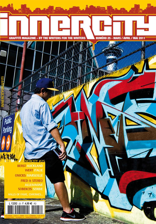 Innercity, 25e édition ! Et une fois encore nous sommes allés vous chercher très très loin – en Nouvelle Zélande – un writer qui bouleverse les codes du graffiti classique pour produire des pièces proprement hallucinantes qui n'ont pas fini de faire parler de lui. Nul doute que plus d'un vont essayer de lui emboîter le pas à leurs risques et périls tant Berst est bourré de talent… Ensuite, direction l'Italie avec Wert, un writer discret qui, à sa façon lui aussi, produit des lettres colorées et d'une efficacité redoutable. Un détour par Marseille avec Onickz aussi à l'aise avec les lettres que les persos, puis à l'Est toute ! Avec d'abord l'Allemagne et la Suisse et le duo Fred & Stéréo, et enfin la Serbie avec la fratrie de choc Sobekcis qui nous prouve, une fois encore, que l'avenir du graffiti en Europe est peut-être en train de se peindre au-delà des vestiges du mur de Berlin…