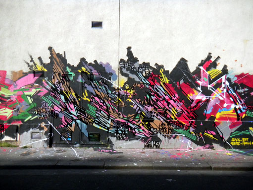 « Nous, on cherchait uniquement le clash graphique avec les autres groupes mais on avait pas de réponses, on s'est donc replié sur nous-mêmes et on a développé plusieurs manières d'élaborer nos compositions et nos lettres. On a favorisé l'aspect éclaté, déstructuré, stratifié en réduisant l'utilisation des couleurs pour avoir un meilleur impact et pour guider le regard sur les mots transformés par l'utilisation de segments. Ils fragmentent les lettres, de manière presque mécanique, saccadée. »