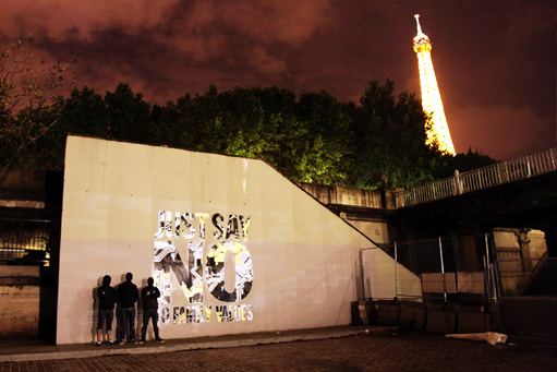 Comme un clin d'œil, ils ont ensuite récupéré le négatif d'un de ces poèmes pour le coller avec l'aide de Dem189, sur un mur gris des berges, situé de l'autre côté de la Seine, en face du Palais de Tokyo :