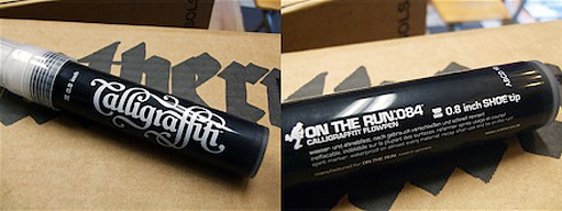 A l'occasion de la sortie du livre Calligraffiti de Shoe que nous annoncions ici, On The Run propose un modèle collector de son grand classique, le Flowpen OTR.084. Comme le modèle de série, ce marqueur est rechargeable et rempli d'une encre permanente indélébile noire… mais celui-ci est doté d'une pointe biseautée de 1,5cm spécialement conçue pour la calligraphie, et le réservoir est désigné spécifiquement par Shoe pour l'occasion.