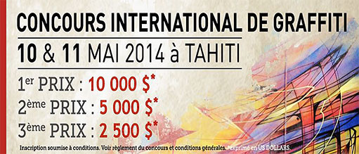 Ono'u, le 1er Festival International de Graffiti de Tahiti se tiendra les 10 et 11 Mai 2014 à Papeete. A cette occasion est organisé un concours ouvert aux graffeurs du monde entier âgés de 18 à 38 ans.