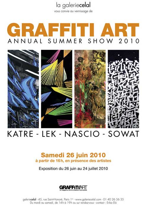 La galerie Celal vous convie au vernissage de Graffiti Art Annual Summer Show 2010, le samedi 26 Juin 2010 à partir de 16h en présence des artistes : Katre, Lek, Nascio, et Sowat.