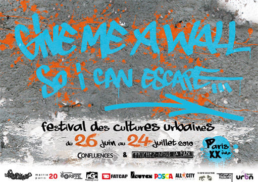 Du 26 Juin 2010 au 24 Juillet 2010 à Paris, le festival des cultures urbaines Give me a wall so I can escape est articulé autour d'expositions de photos et de toiles, de plusieurs soirées de projections, de concerts, et des performances live de graff.