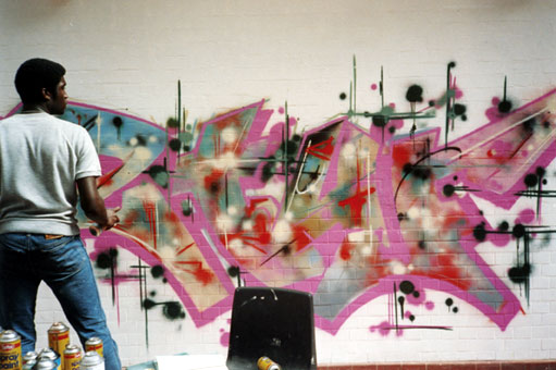 Au début de l'été 1984, après m'être fait la main sur papier peu de temps auparavant. Je me souviens même avoir fait un lettrage wild style avec de la peinture émail sur quelques coupe-vents Nike bleu marine et grise pour ce crew appelé Street Rockers à Covent Garden. C'était un tel buzz autour de ce mouvement au cours de cet été, avant même que Subway Art, Breakin ‘(Breakdance au Royaume-Uni), et Beat Street ne sortent au cinéma. Nous avions Tim Westwood sur LWR tous les mercredis soirs, Spats, le samedi de midi à 15h, et Covent Garden, Leicester Square la nuit, et les passages souterrains autour de la station Charing Cross. En particulier la vitrine d'un restaurant appelé The Tappit Hen, les gars perfectionnaient leur pas de danse en se regardant dans le reflet. Scribla était danseur ainsi qu'un gars nommé Mc Duke, mon frère et moi on les regardait danser depuis l'automne précédent. J'ai découvert que c'était un writer quand il est tombé sur mes dessins et m'a raconté comment il s'était fait serrer pour avoir fait un graff sous le Colisée, il était en probation pour un an. C'est lui qui m'a fait découvrir la peinture aérosol.